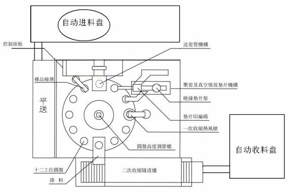 的套管作業(yè),采用12工位圓盤,由自動(dòng)放置適合規(guī)格之電容器裸品,再自動(dòng)完成套管、收縮、排料過程。